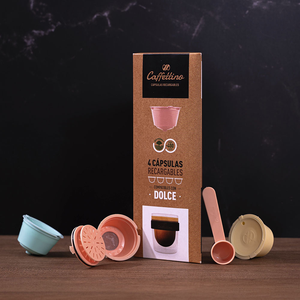 4 Cápsulas recargables compatibles con máquinas Dolce Gusto. Usá tu café favorito y ahorrá en cápsulas descartables, elevá tu experiencia y usá con café de especialidad con el molido correcto.