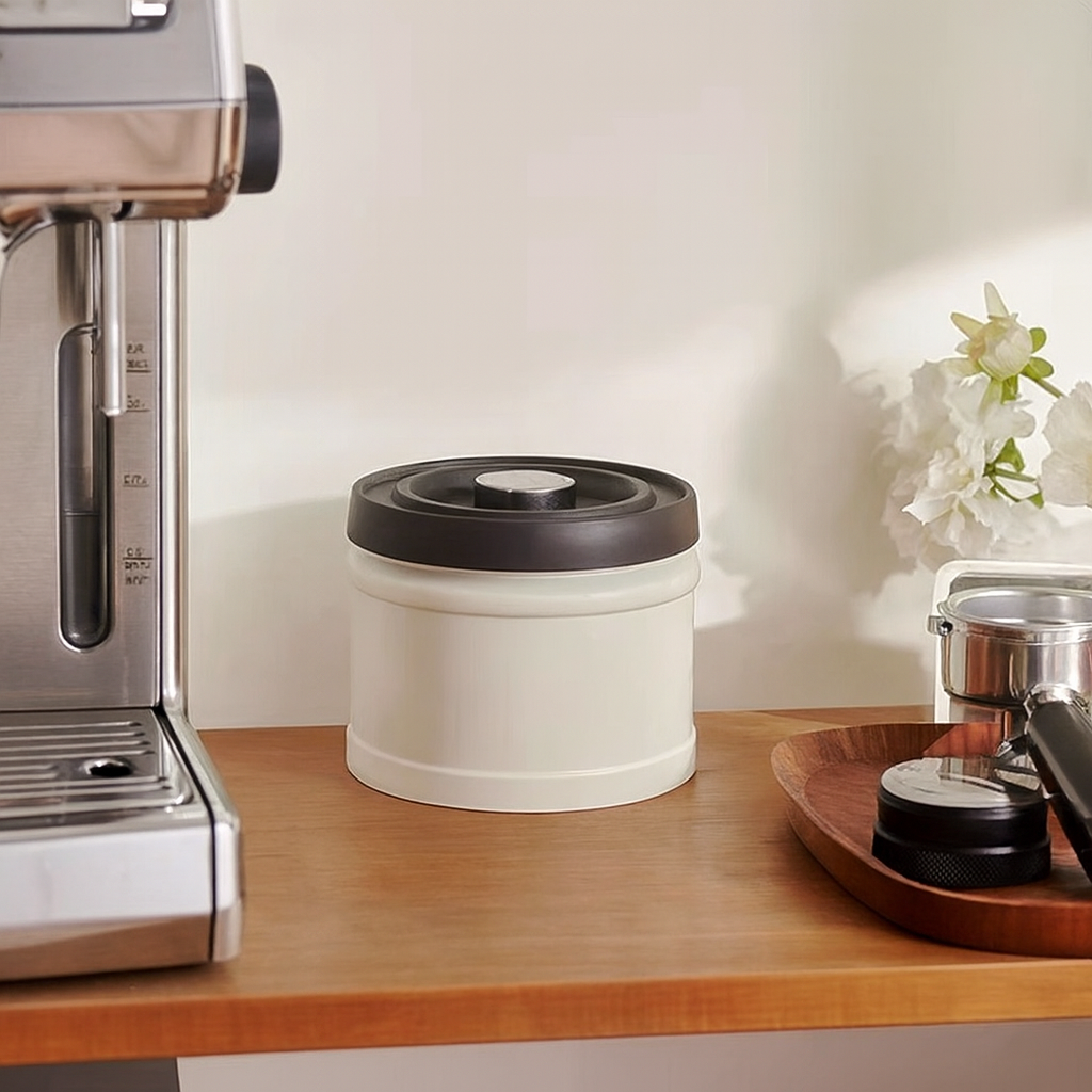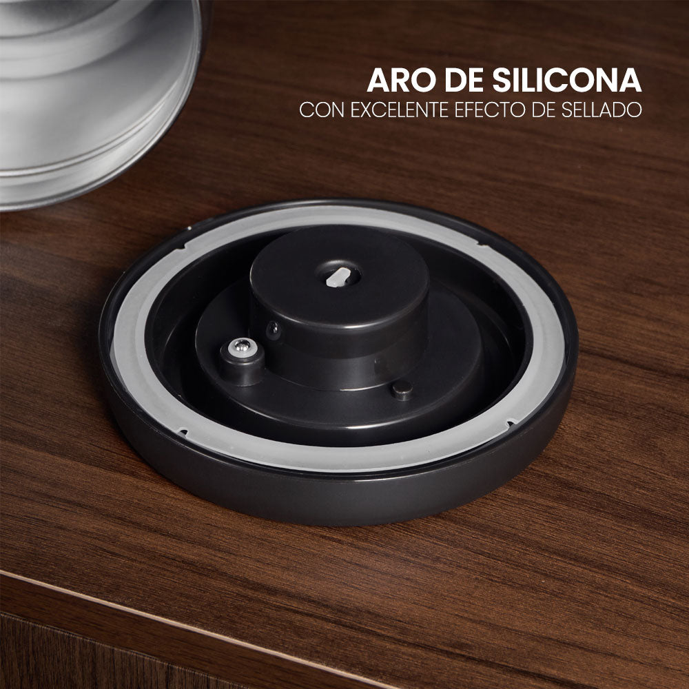 Recipiente de café con cierre hermético y una innovadora tapa con bomba manual que permite hacer vacío en su interior. Esto garantiza preservar la calidad y el sabor de los granos de café durante un tiempo más prolongado luego de retirarlo del packaging.